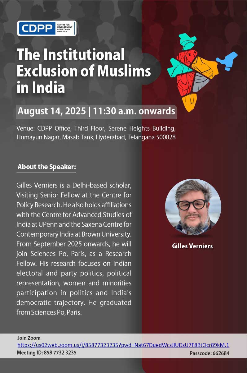 On August 14, 2025, the Centre for Development Policy and Practice hosted a thought-provoking lecture by Gilles Verniers, titled The Institutional Exclusion“The Institutional Exclusion of Muslims in India.” Mr. Verniers, a Delhi-based scholar and Visiting Senior Fellow at the Centre for Policy Research, will soon join Sciences Po, Paris as a Research Fellow. His research focuses on Indian electoral politics, political representation, and the participation of minorities and women in democratic life.