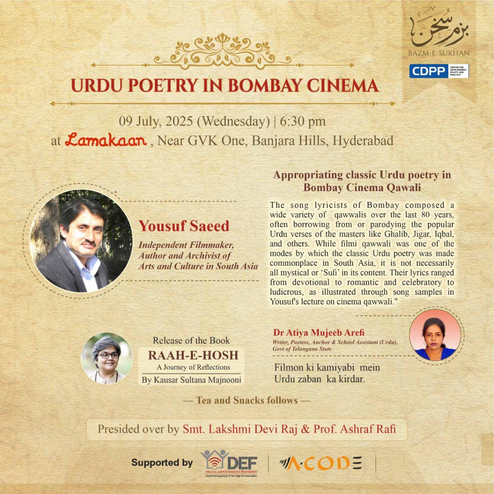 Join us on Wednesday, 9th July 2025, at Lamakaan, Hyderabad, for an enriching evening "Urdu Poetry in Bombay Cinema”